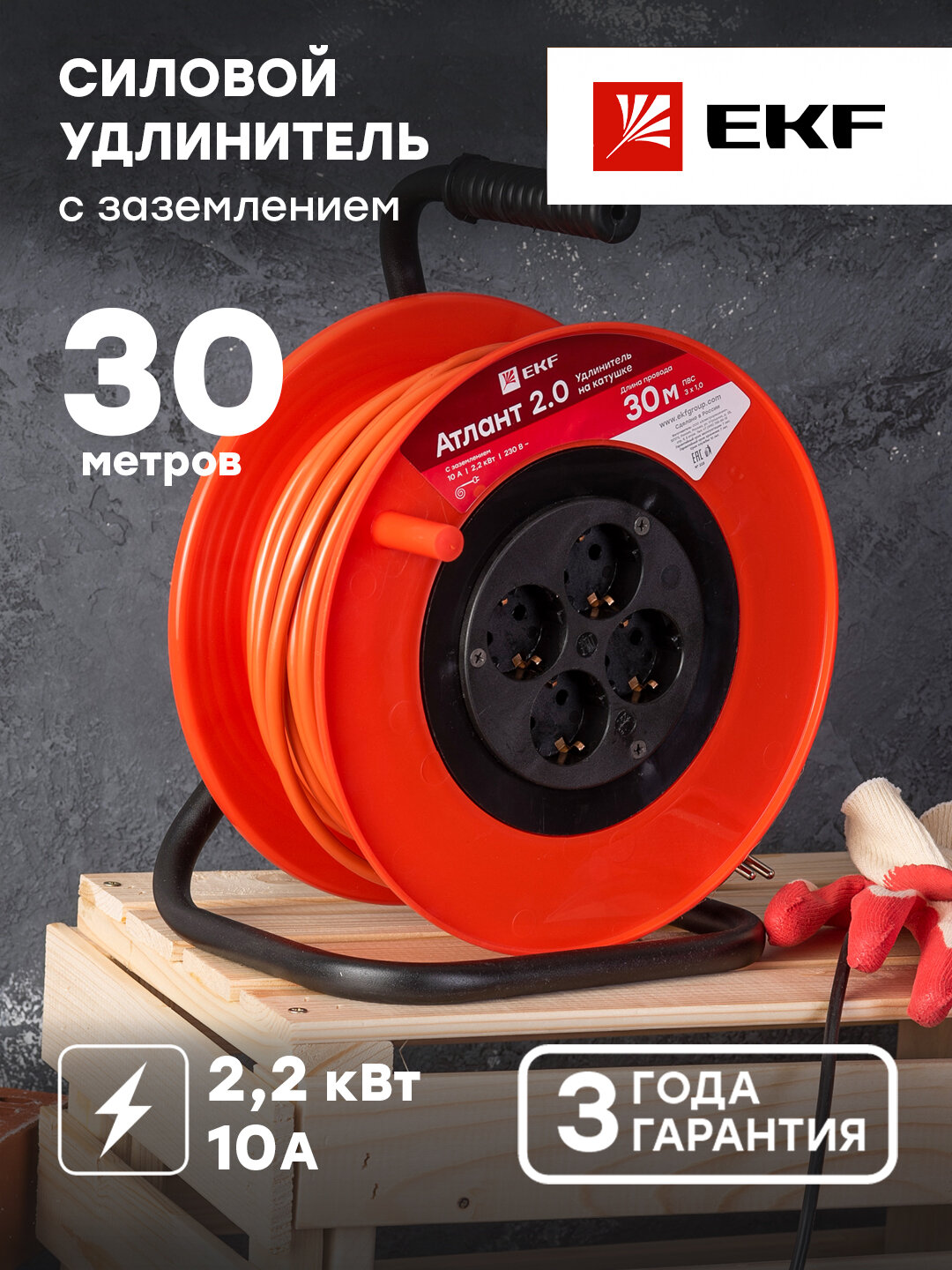 Удлинитель на катушке 4х30м с заземл.10А IP20 Атлант 2.0 ПВС 3х1 2.2кВт PROxima UKA02-10-310-4-30 EKF