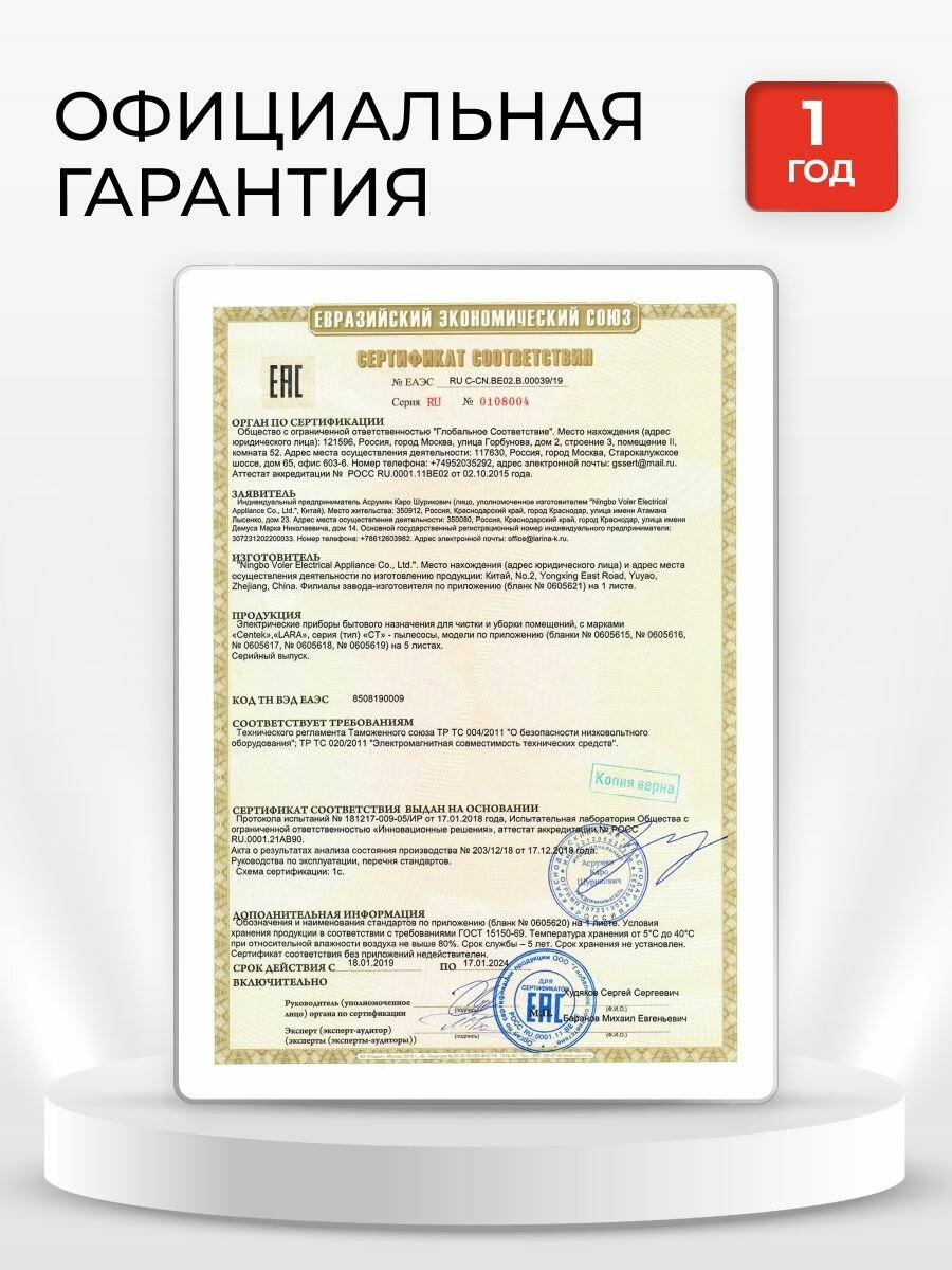 Вертикальный пылесос Centek CT-2566, потребляемая мощность 800Вт, мощность всасывания 150Вт