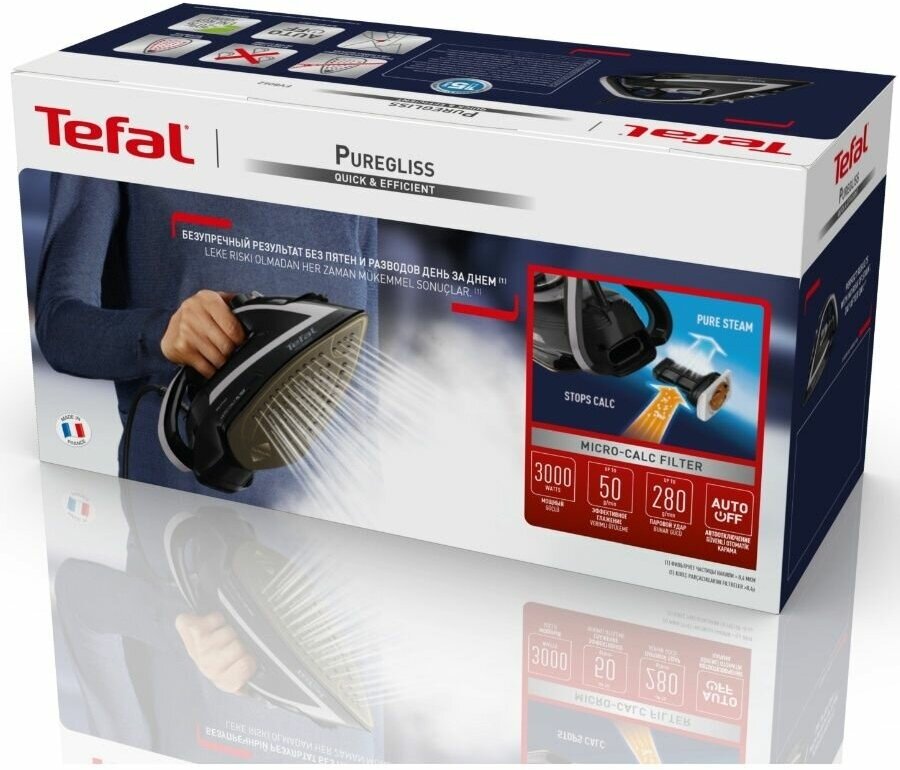 Паровой утюг Tefal Puregliss FV8062E0, с автоотключением, вертикальным отпариванием, защитой от накипи, 3000 Вт, Франция