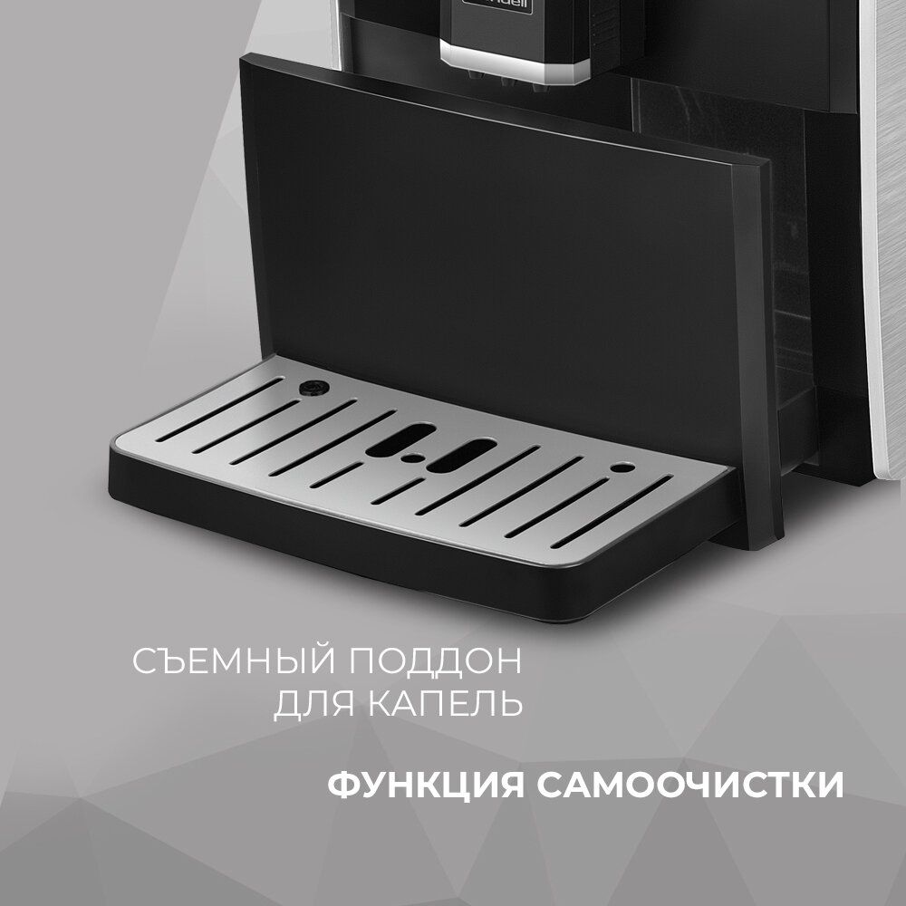 Современный дизайн, проста в обращении: понятное меню, легко моется. Расход зерен небольшой. Кофе готовит быстро и вкусно. А больше ничего и не надо.