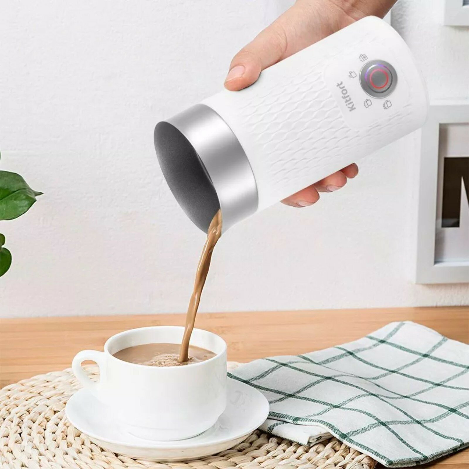 | Плюсы: | Приобрела капучинатор kitfort. Очень понравились режимы: тёплая плотная пенка, тёплая воздушная. Также есть смешивание, холодное вспенивание, очень удобно! Работает не шумно и очень быстро. Прибор компактный, так что отсутсвие ручки не влияет на удобство наливания. Рекомендую к приобретению? |