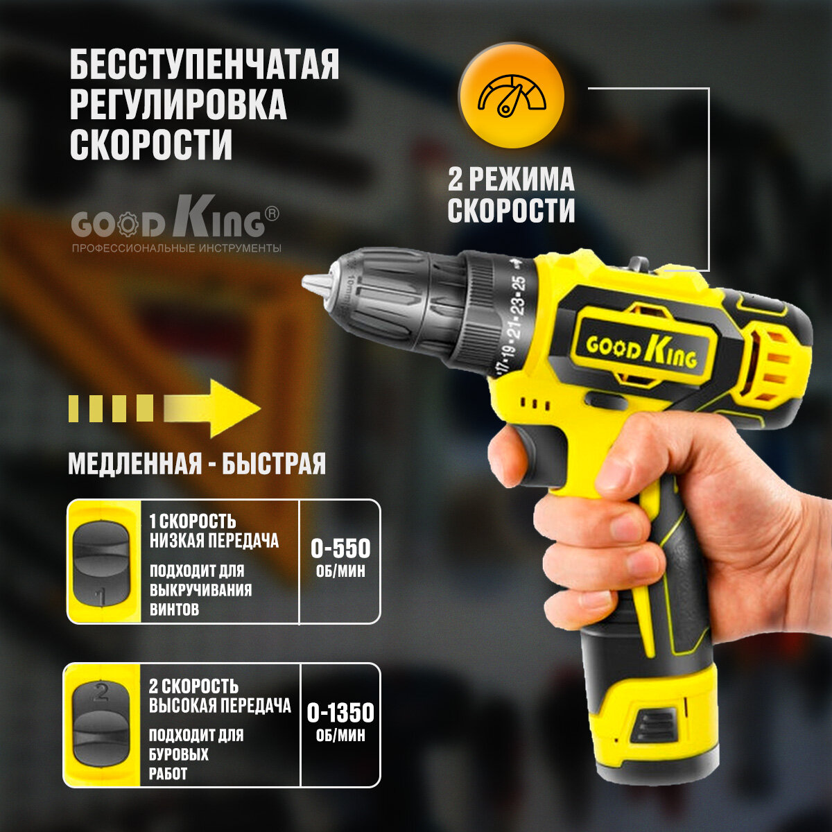 Аккумуляторная дрель-шуруповерт GOODKING EC-1202193 2АКБ 12В 1.5 Ач 20Нм, набор инструментов.