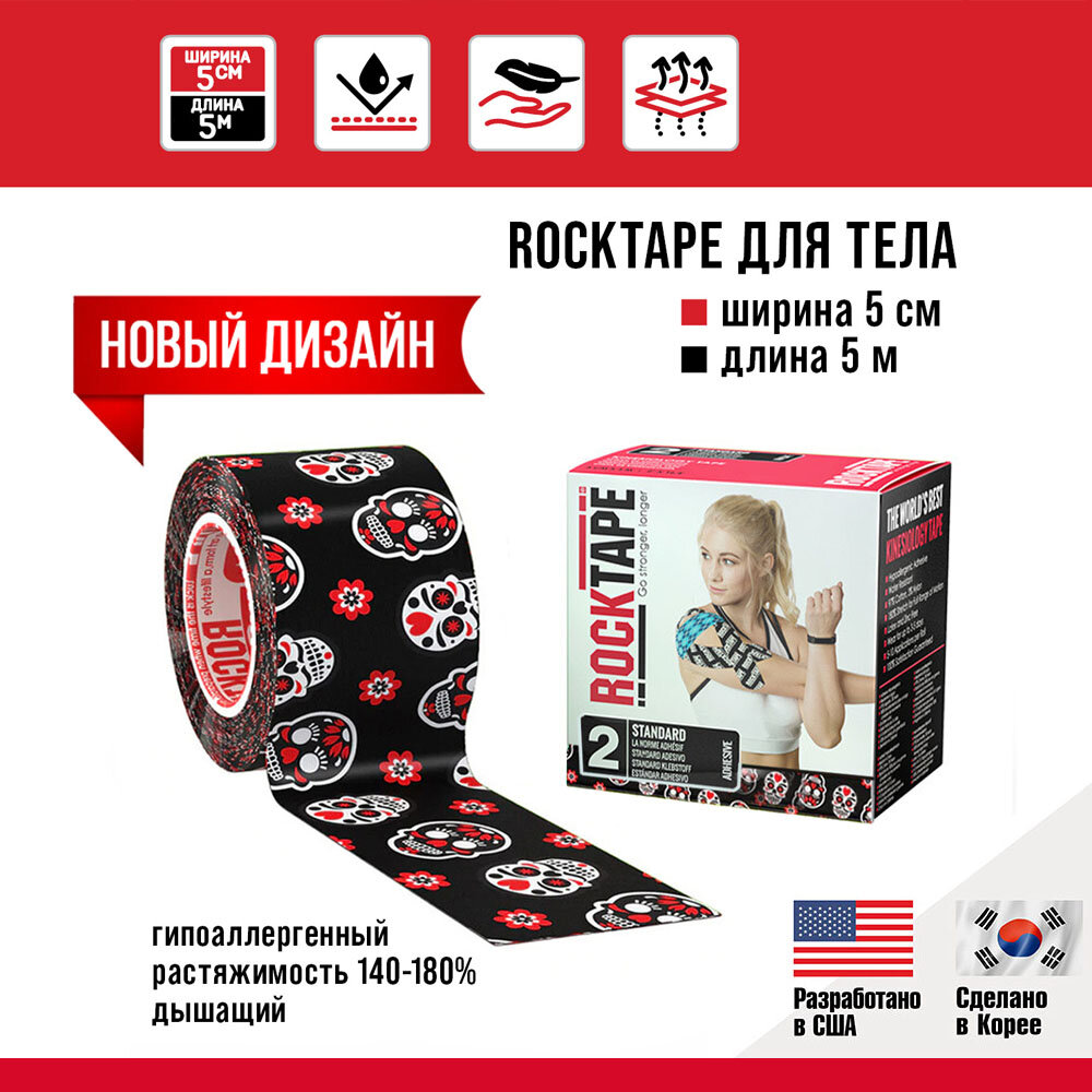 Кинезиотейп Rocktape 5 см х 5 м, Skull Black