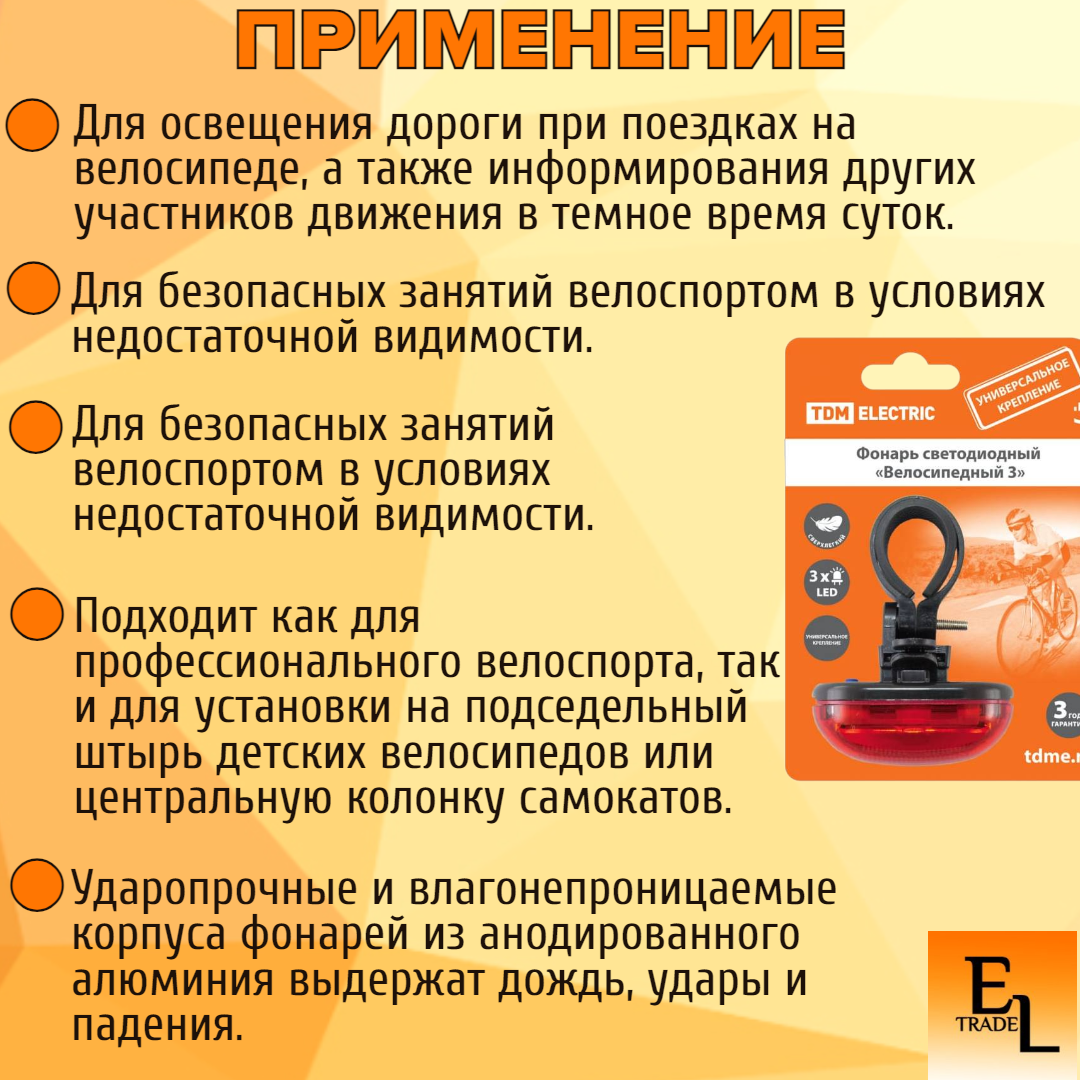 Ниже Вы можете прочитать отзывы на Фонарь светодиодный "Велосипедный 3" 3 режима работы, 3 LED, 20 лм/Вт 2*AAA TDM SQ0350-0029, ознакомится с подробными характеристиками, посмотреть интересные обзоры и фотографии на Фонарь светодиодный "Велосипедный 3" 3 режима работы, 3 LED, 20 лм/Вт 2*AAA TDM SQ0350-0029.