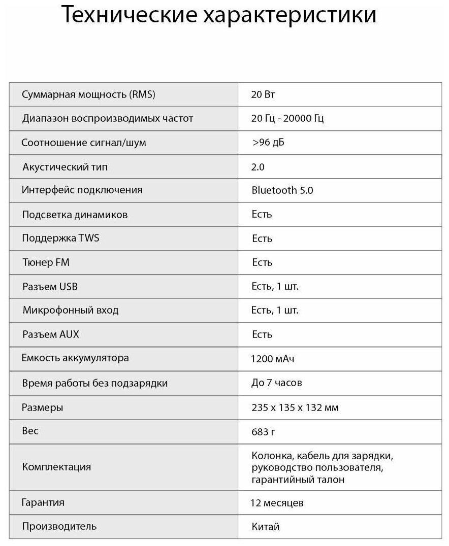 | Плюсы: | При небольших размерах достаточно громкая в 20 вт, современный дизайн, подсветка динамиков меняет режим работы и отключается при необходимости |