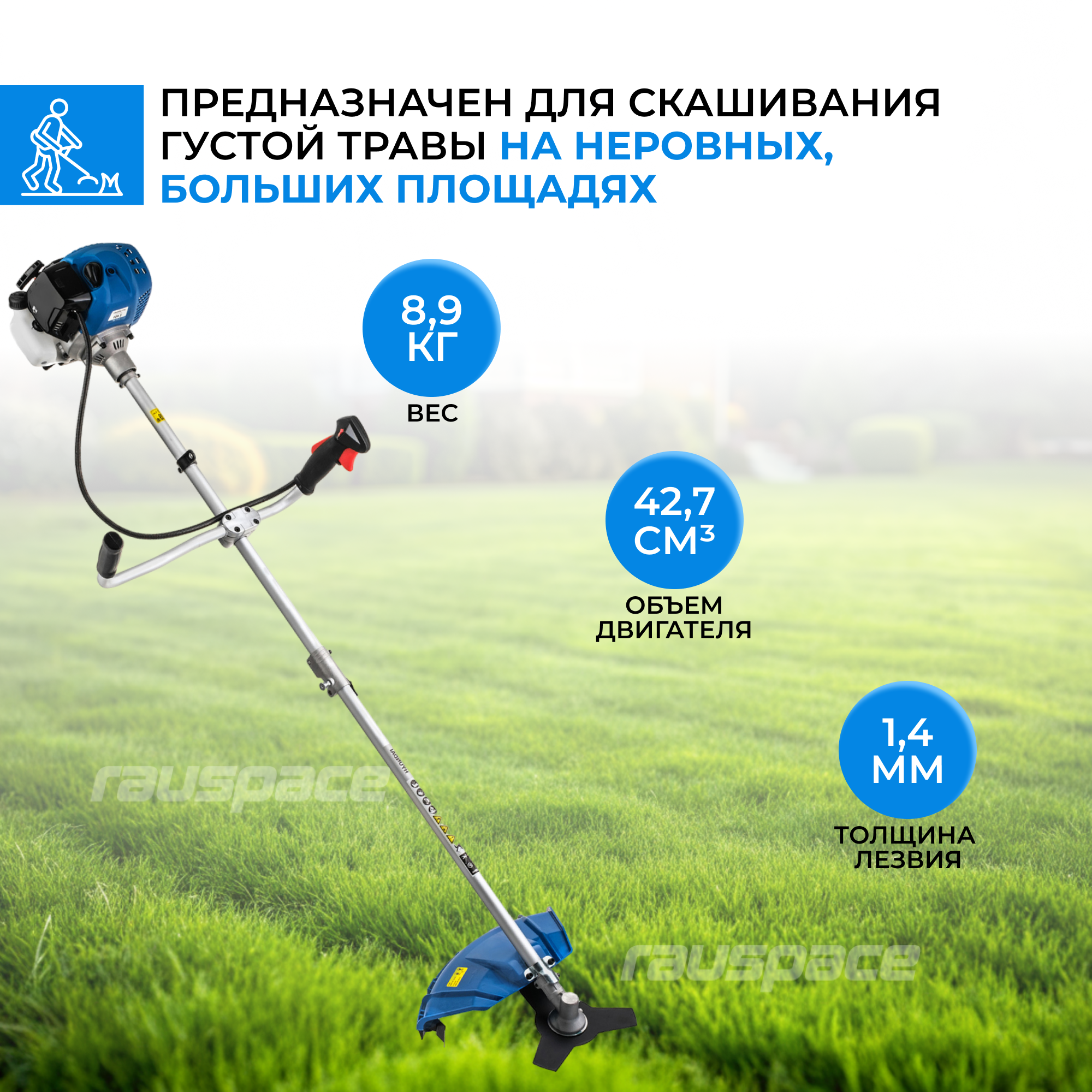 | Особенности | количество оборотов леска/нож, 6900/7500 об/мин; ширина среза/диаметр (нейлоновая леска) 450 мм/2,8 мм; ширина среза/толщина (лезвие 3Т) 255 мм/1,4 мм; модель двигателя IC 43 |