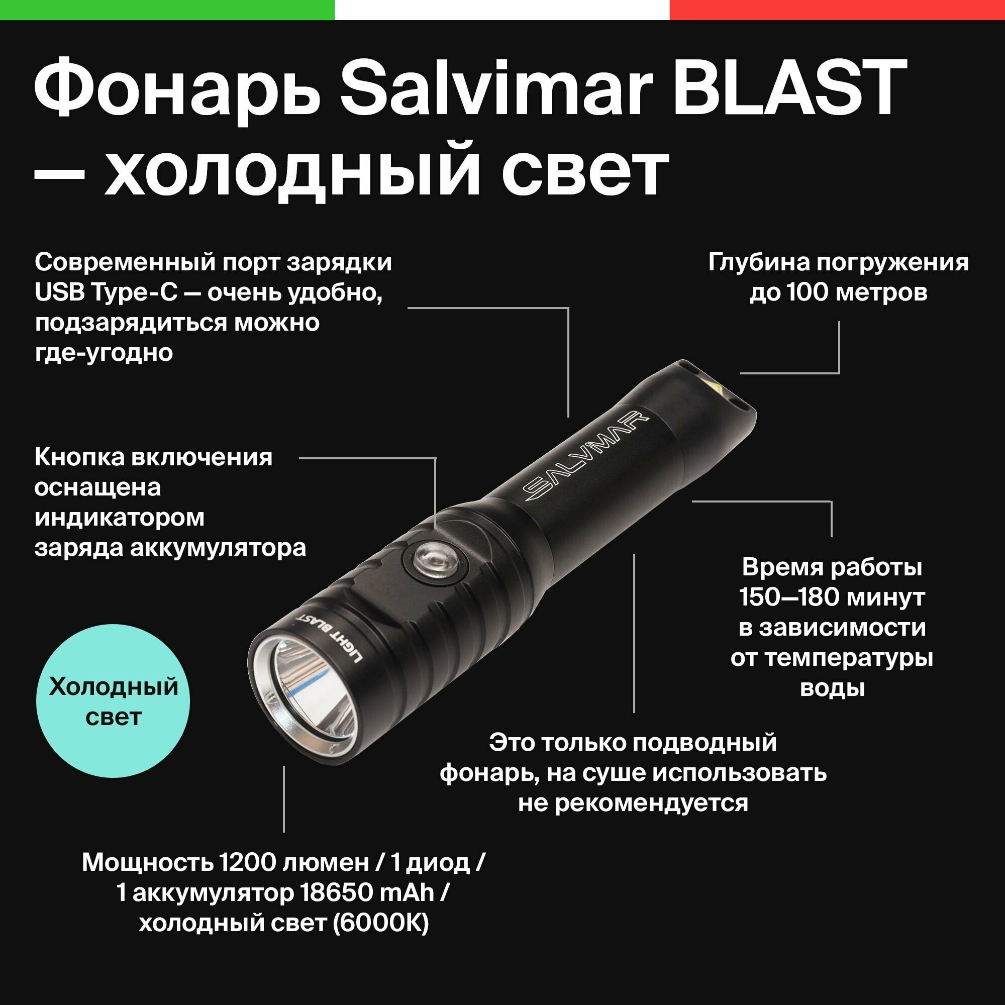 Фонарь подводный Salvimar Blast, 1200 люмен, холодный свет интересное: