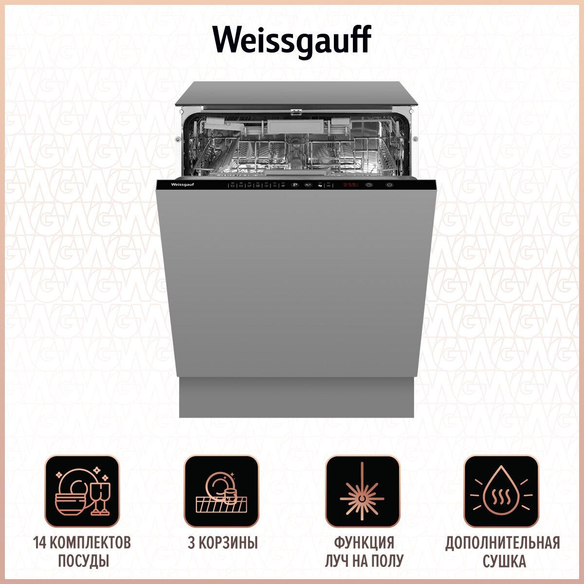 Встраиваемая посудомоечная машина с лучом на полу Weissgauff BDW 6036 D Infolight, 3 корзины, 14 комплектов, 6 программ, дополнительная сушка, автопрограмма, полная защита от протечек, таймер