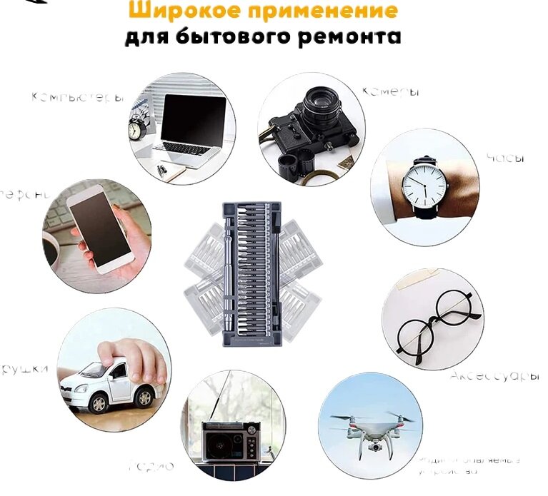 | Плюсы: | Магнитная отвёртка с вращающимся упором(можно использовать как антистресс), много разных бит, удобный металлический кейс, есть пинцет. |