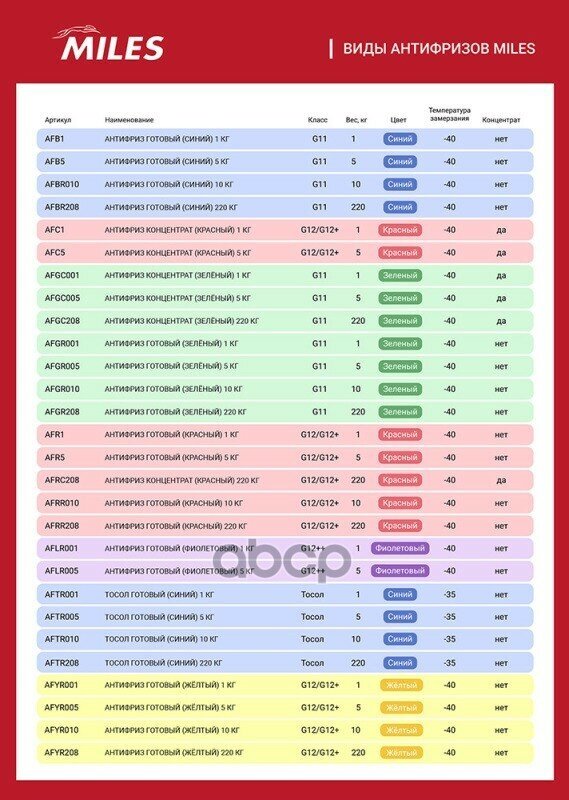 Ниже Вы можете прочитать отзывы на Антифриз Концентрат G12/G12+ (Красный) 1Кг (Super Long Life Coolant -40C) Afc1 Miles арт. AFC1, ознакомится с подробными характеристиками, посмотреть интересные обзоры и фотографии на Антифриз Концентрат G12/G12+ (Красный) 1Кг (Super Long Life Coolant -40C) Afc1 Miles арт. AFC1.