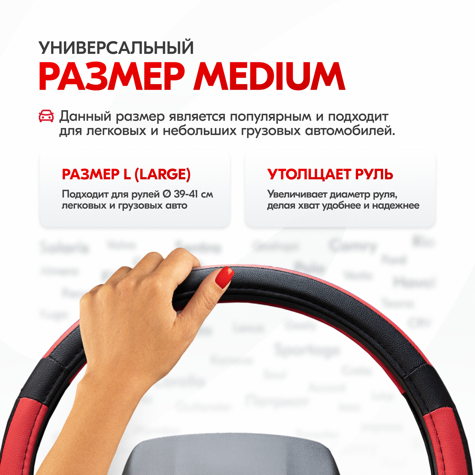 | Дополнительная информация | Рекомендации производителей: выбирайте оплётку под размер вашего рулевого колеса. Неверно выбранный размер может стать причиной проскальзывания оплётки или привести к невозможности снять или надеть её на руль. |