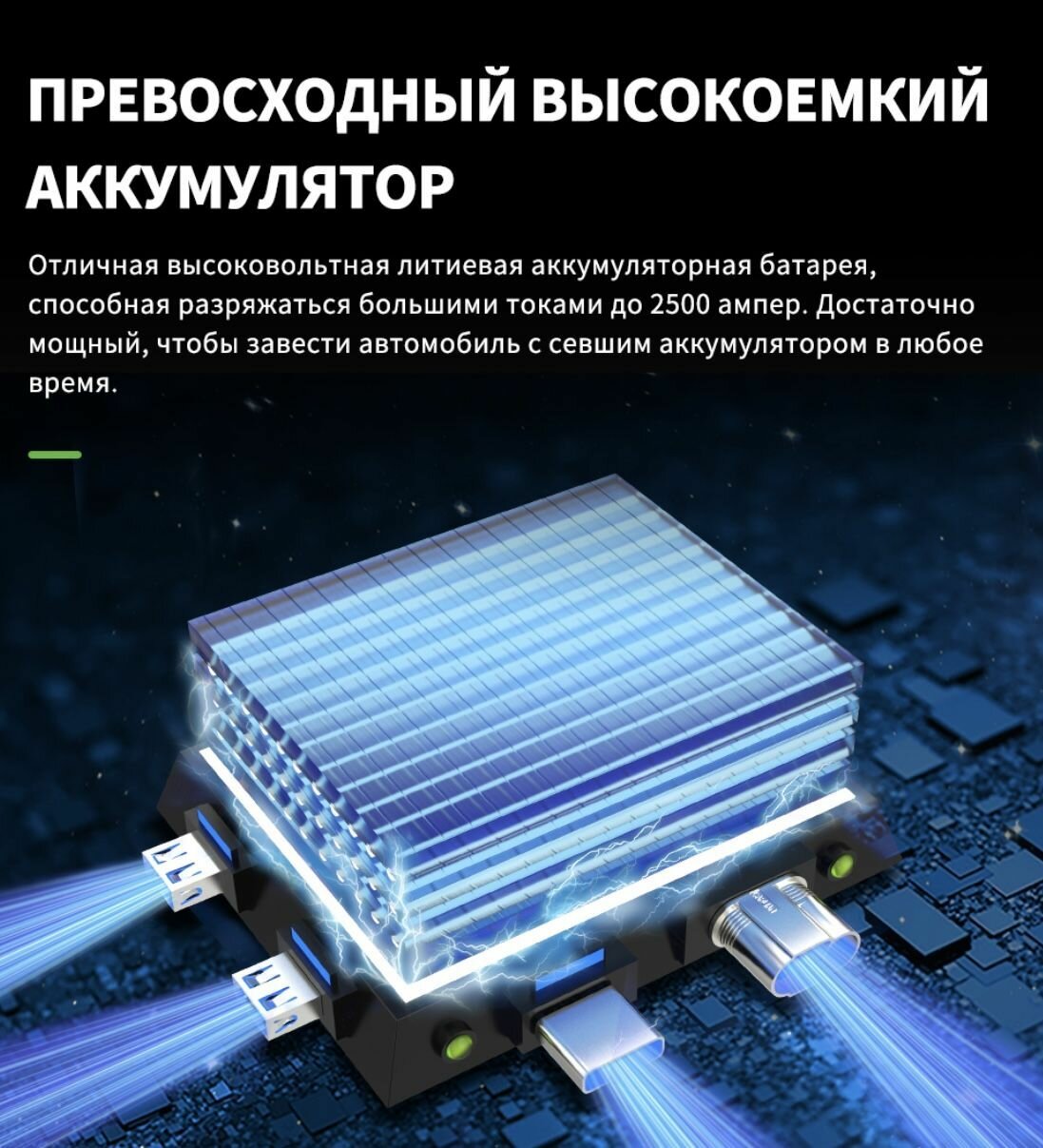 | Дополнительная информация | Емкость аккумулятора: 8000 мАч Пиковый ток: 1000A Бензин: 4,0 л Дизель:2,5 л 1. Установка четырех высококлассных батарей 2. Вход: 5 В/3 А Выход: 5 В/2,4 А 3. ЖК-светильник с дисплеем питания; 4. Светодиодный светильник, SOS, pos-функции; 5. Защита от короткого замыкания, защита от перегрузки по току; Интегральная плата, включая программное обеспечение и аппаратную защиту. |