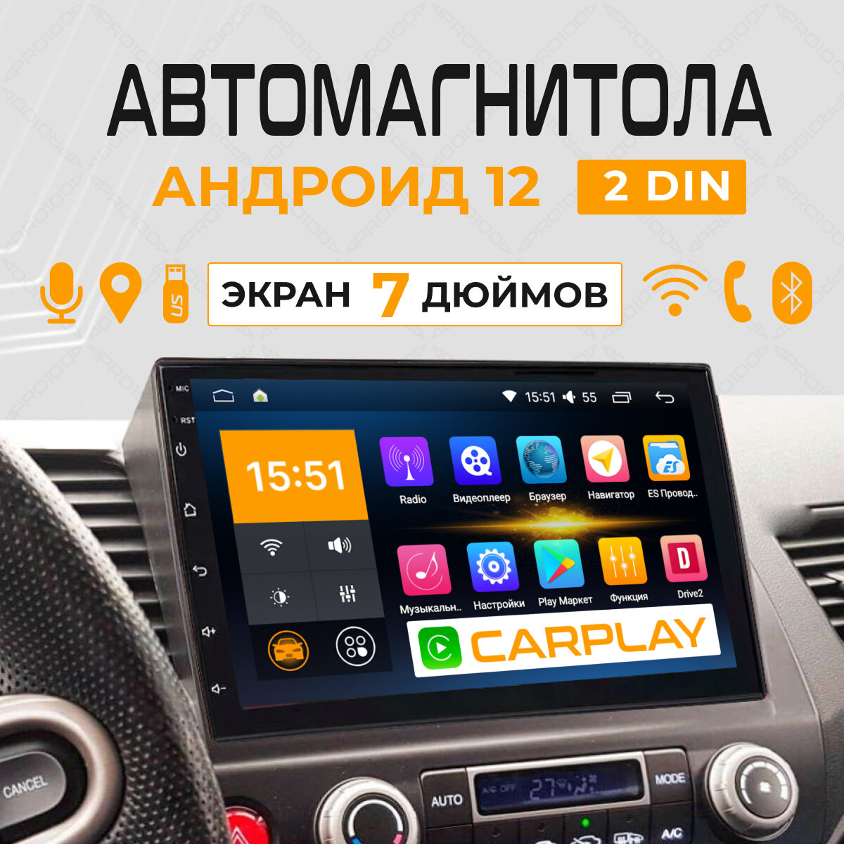 Автомагнитола 2DIN 7 дюймов CarPlay, Android auto (2GB / 32GB, Wi-Fi, GPS, BT) / Автомагнитола с экраном / Bluetooth интересное: