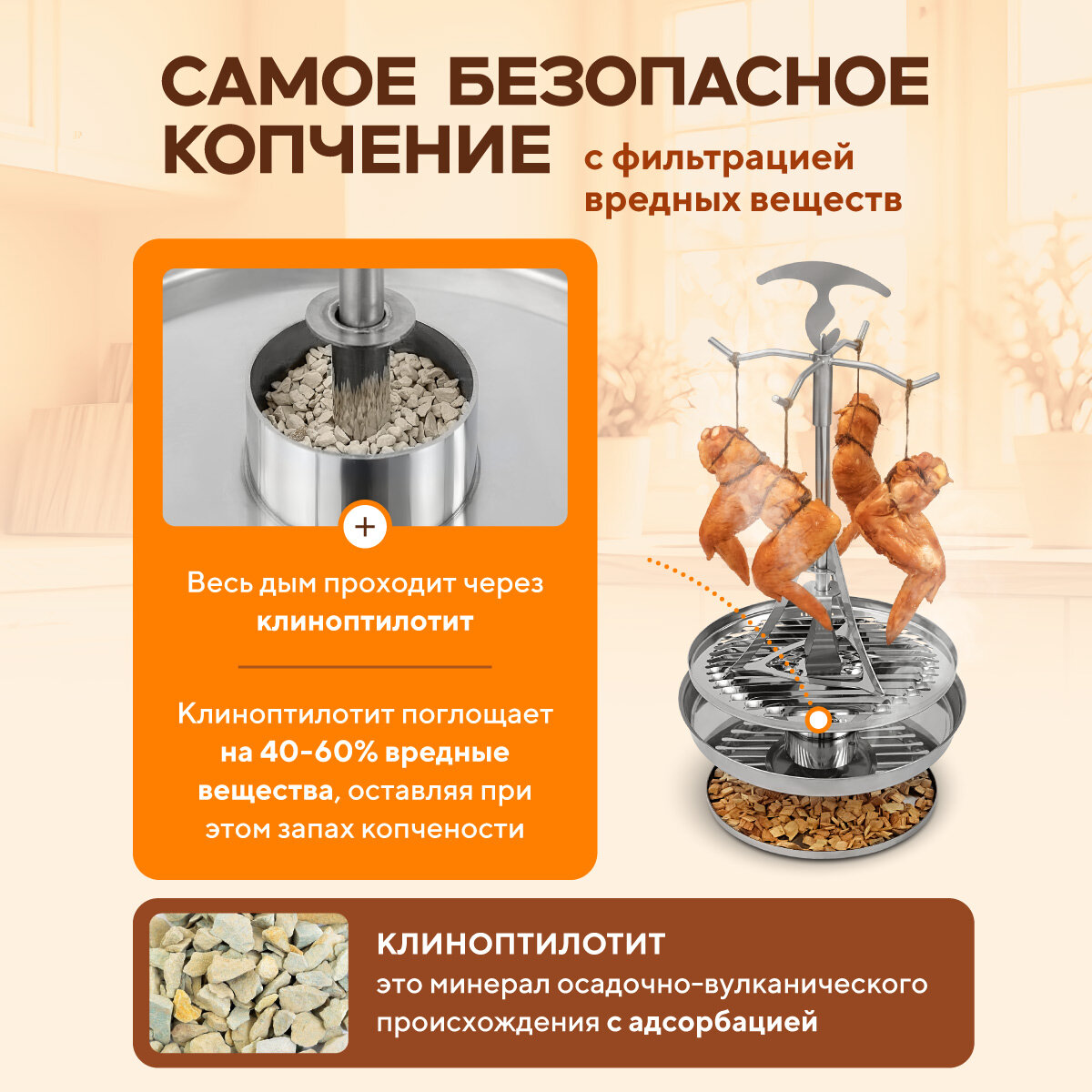 | Плюсы: | Довольно просторный шкаф для копчения. Прозрачная дверца позволит наблюдать за копчением без открытия. |