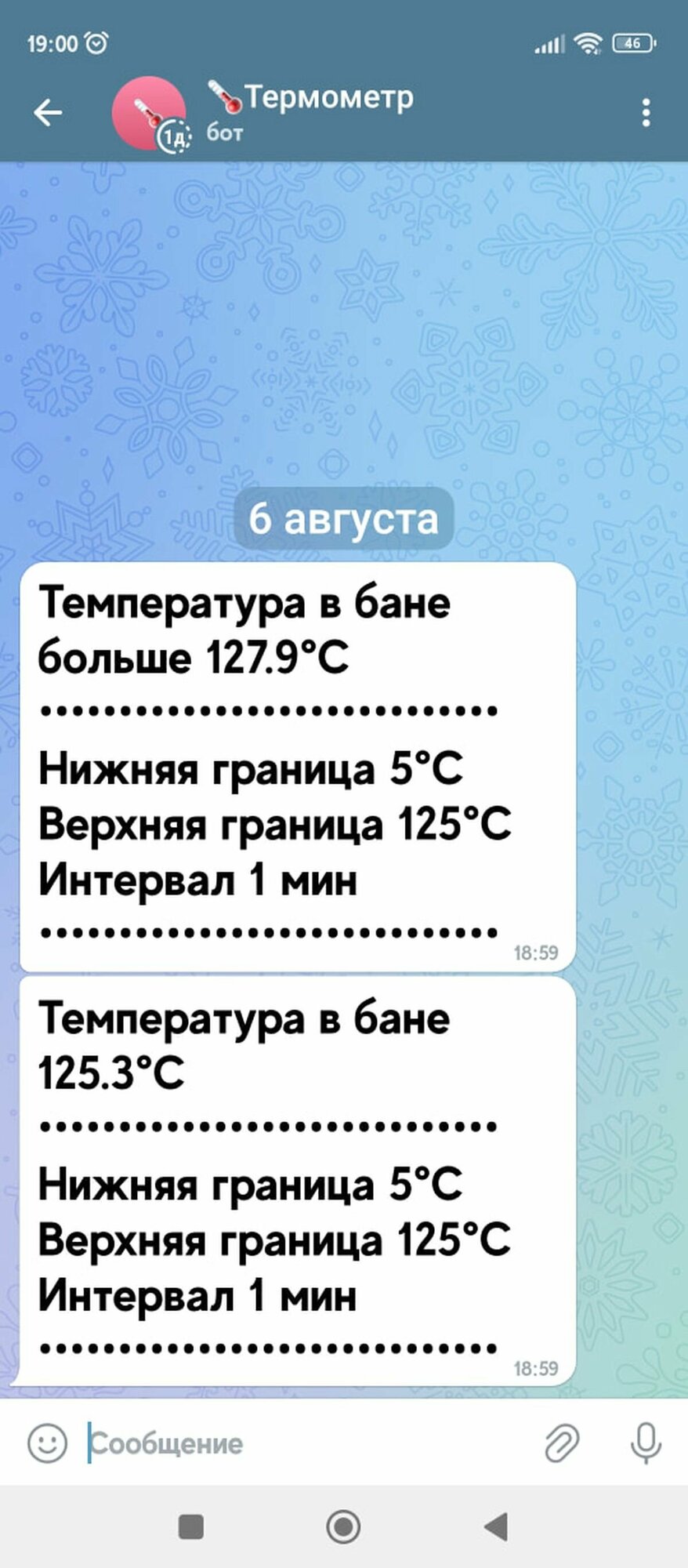 Ниже Вы можете прочитать отзывы на Wi-Fi-термометр-сигнализатор Thermobot-2 для сауны с Telegram-ботом, выносной термодатчик -55 — +125°С, ознакомится с подробными характеристиками, посмотреть интересные обзоры и фотографии на Wi-Fi-термометр-сигнализатор Thermobot-2 для сауны с Telegram-ботом, выносной термодатчик -55 — +125°С.