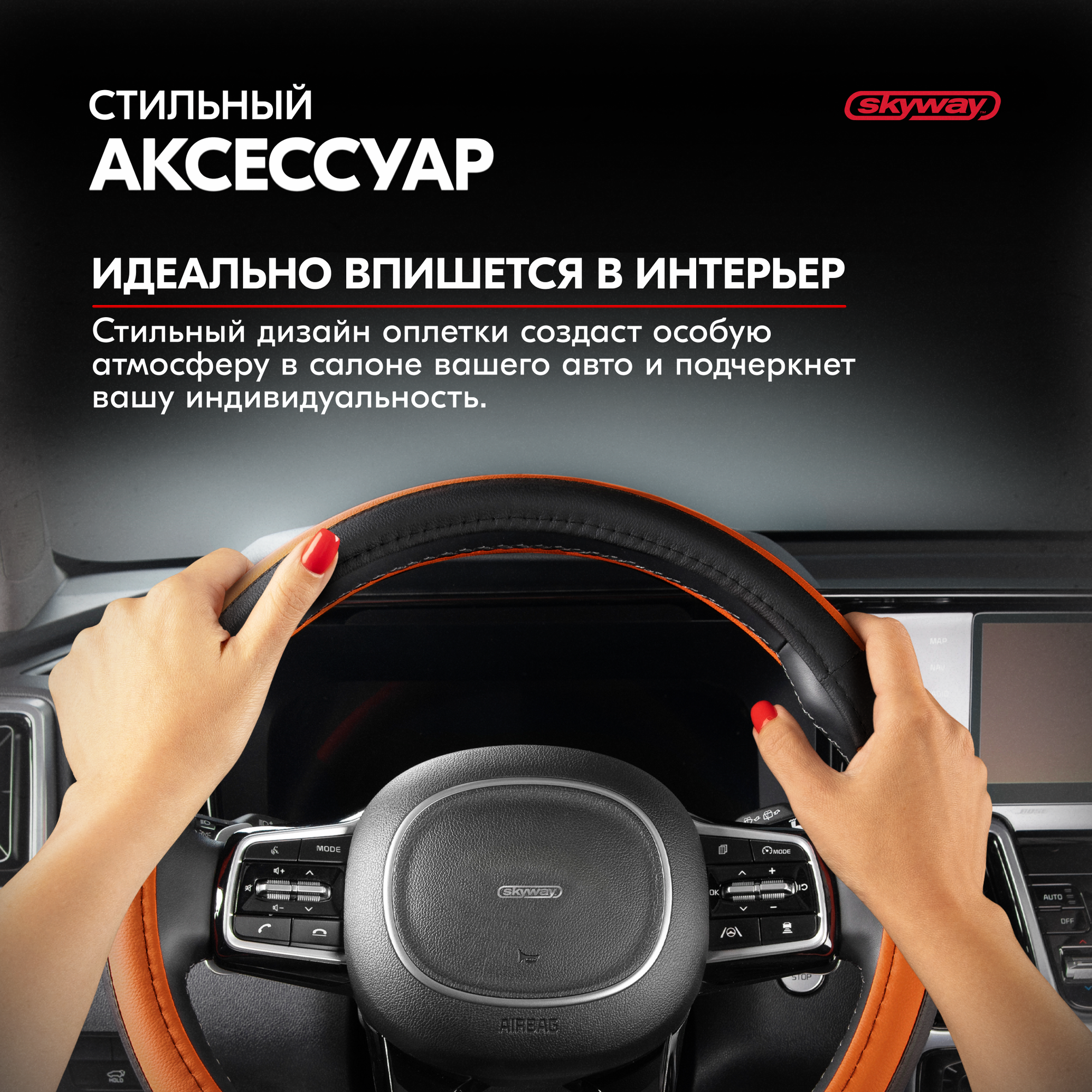 Оплетка руля M 37-38 см кожа черная с оранжевыми вставками SKYWAY S01102362