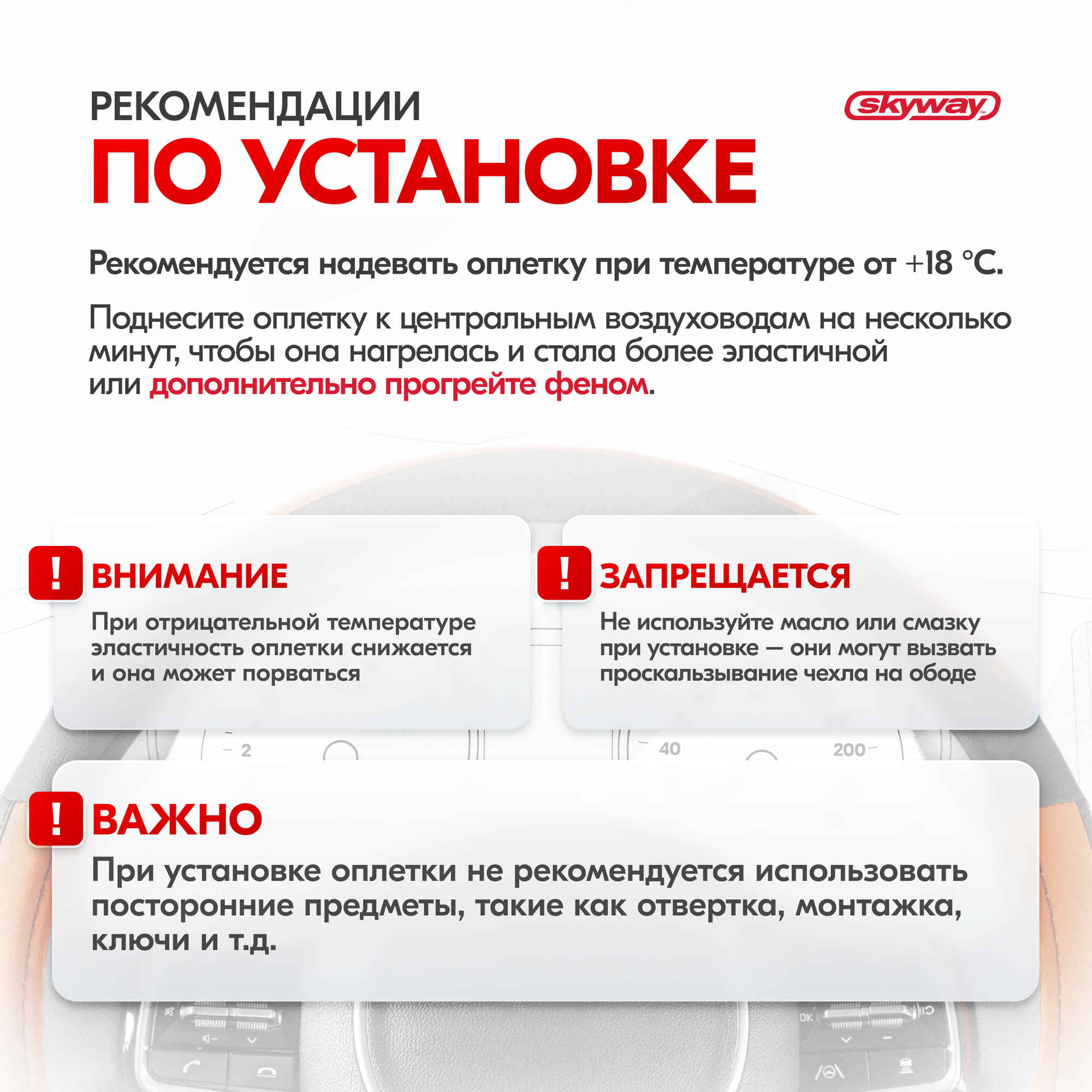 | Дополнительная информация | Рекомендации производителей: выбирайте оплётку под размер вашего рулевого колеса. Неверно выбранный размер может стать причиной проскальзывания оплётки или привести к невозможности снять или надеть её на руль. |