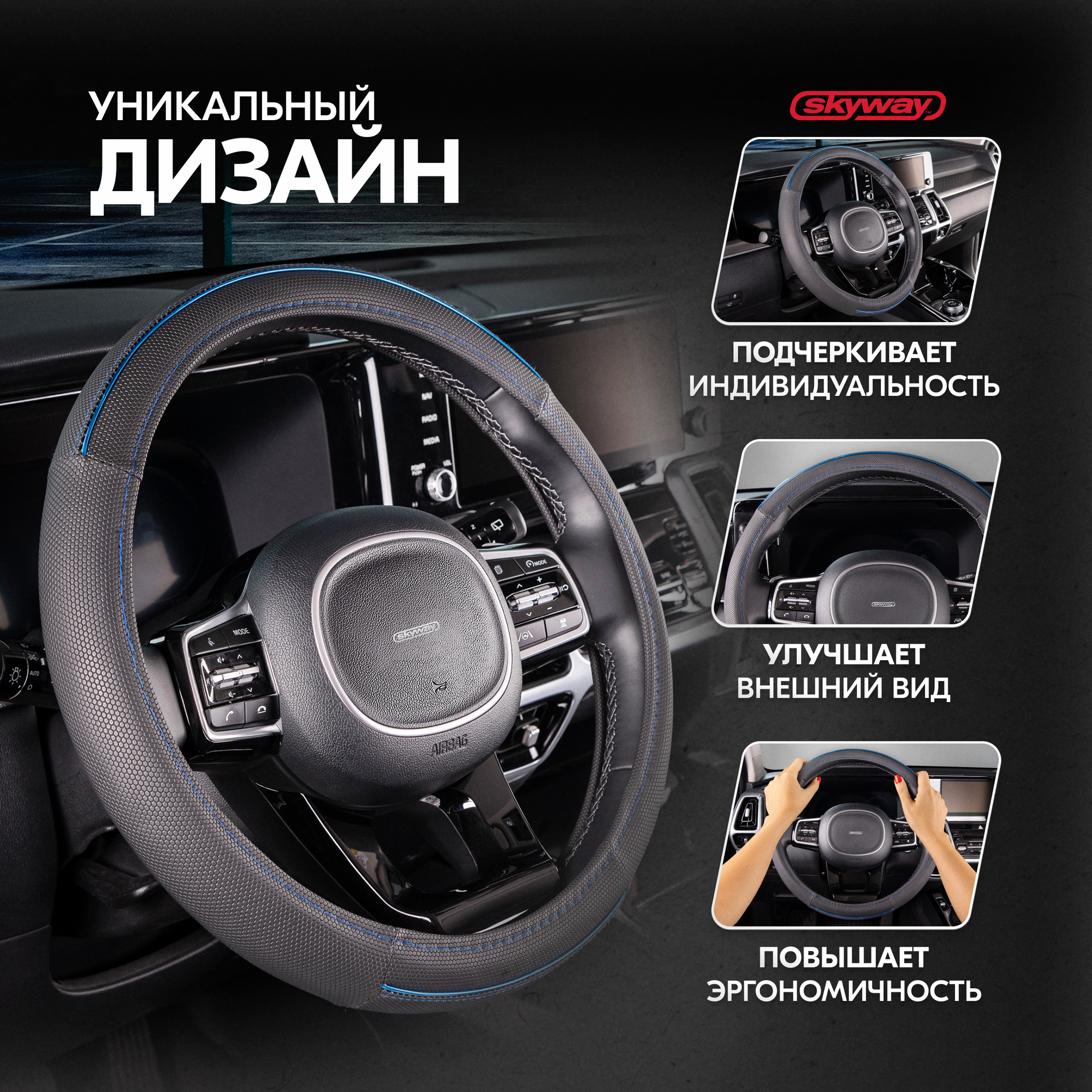 Оплетка на руль Combo-3 SKYWAY M (37-39) черный; синий экокожа, S01102363