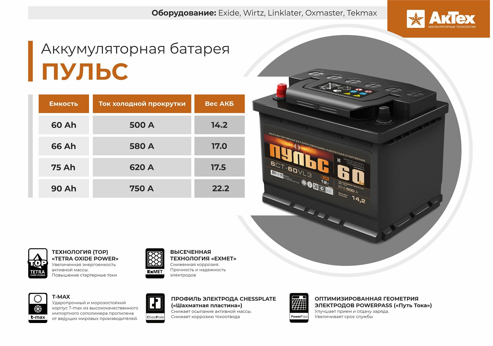 Автомобильный аккумулятор АkТex Пульс, EN500, ОП, 60 А.ч