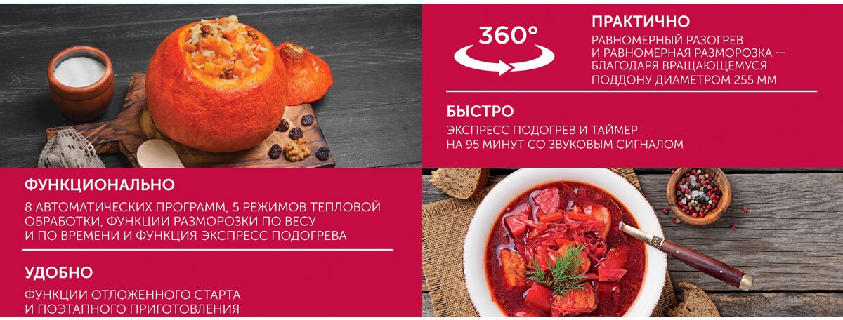 | Особенности | блокировка от детей / дисплей / подсветка камеры / программирование рецептов в память / функция задержки пуска / отдельностоящая/таймер/поворотный стол / таймер |