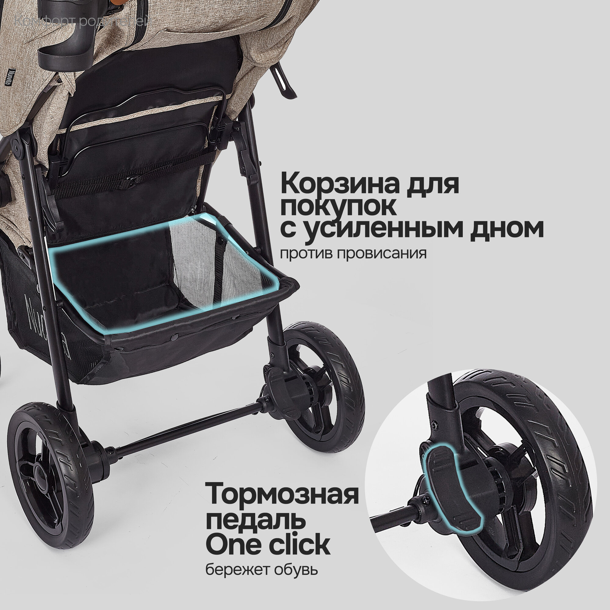 | Минусы: | Не считаю это недостатком, но может для кого-то важно. Когда спинка опущена в низ для сна ребёнка,тогда в корзину ничего не положить так как места нет. |