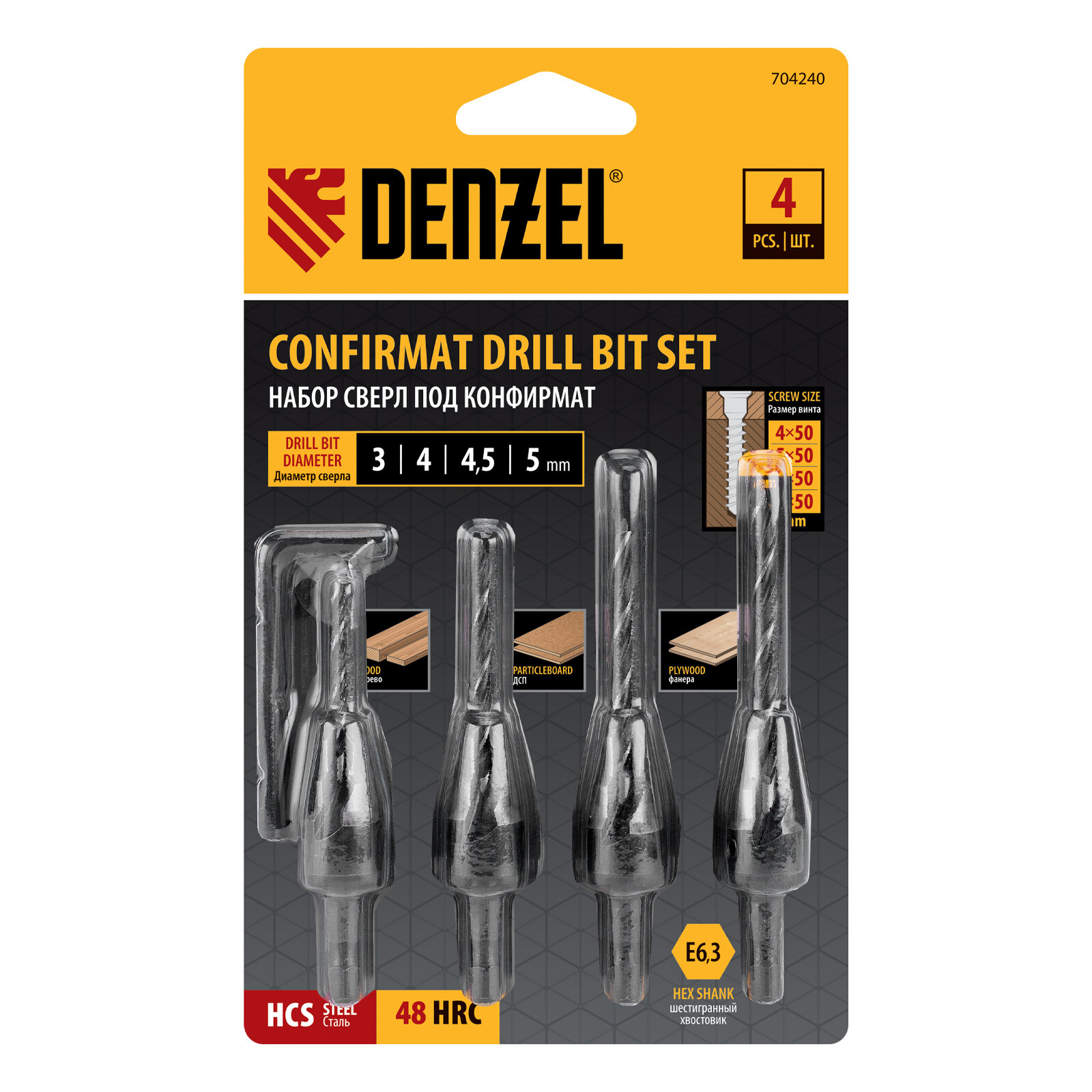 Набор сверл под конирмат Denzel 704240, 3-5 мм, 4 шт Denzel 10049212 .