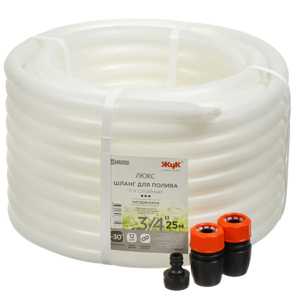 Купить Шланг поливочный Жук Люкс 3/4" 3-х слойный прозрачный 25м с коннекторами