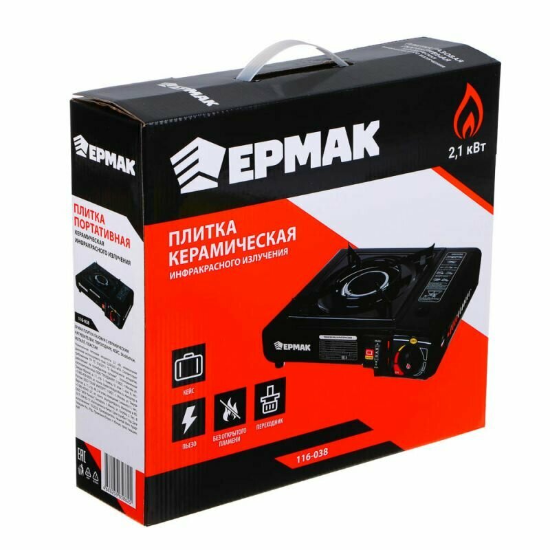 Плитка газовая Ермак 116-038 с керамическим нагревателем, переходник, кейс, 34х26х9см, металл, пластик