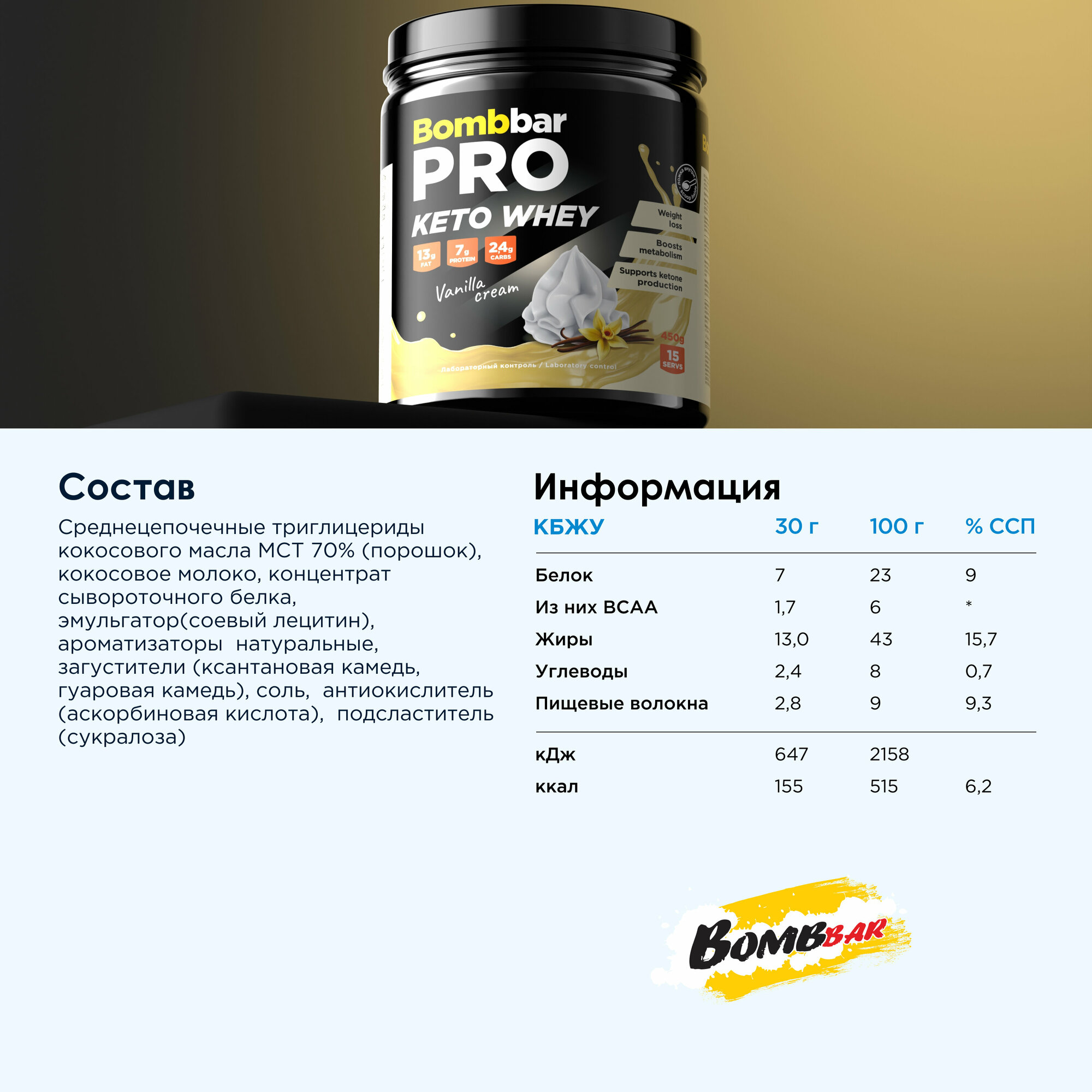 Bombbar Pro Keto Whey Protein Протеиновый коктейль Кето без сахара "Сливки - ваниль", 450 г интересное:
