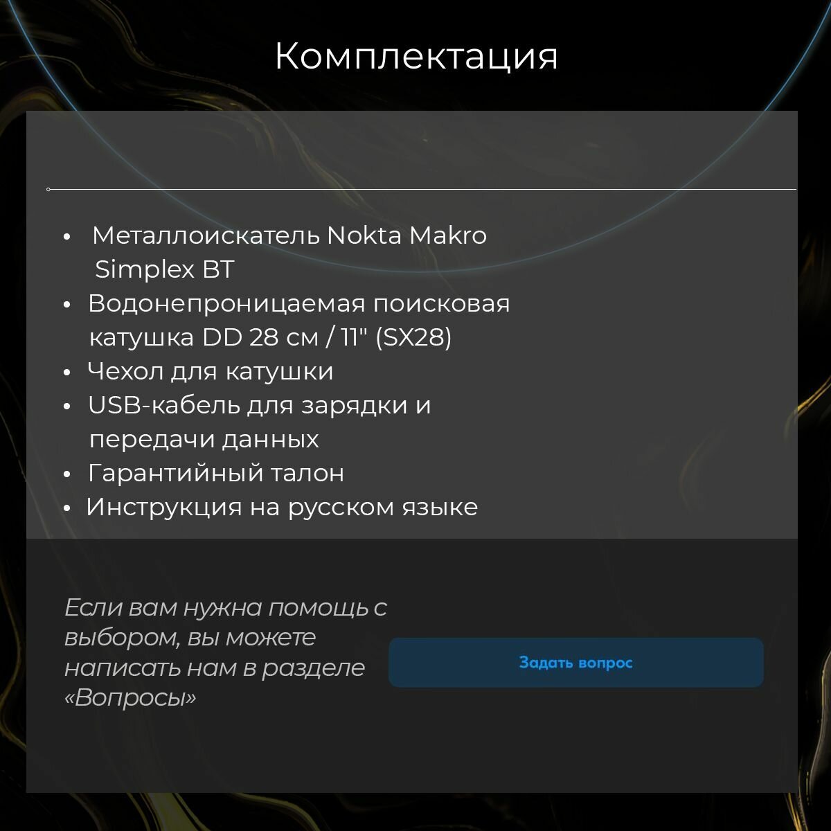 | Комплектация | 1 - Системный блок 2 - Водонепроницаемая поисковая катушка DD 28 см / 11" (SX28) и чехол 3 - USB-кабель для зарядки и передачи данных |