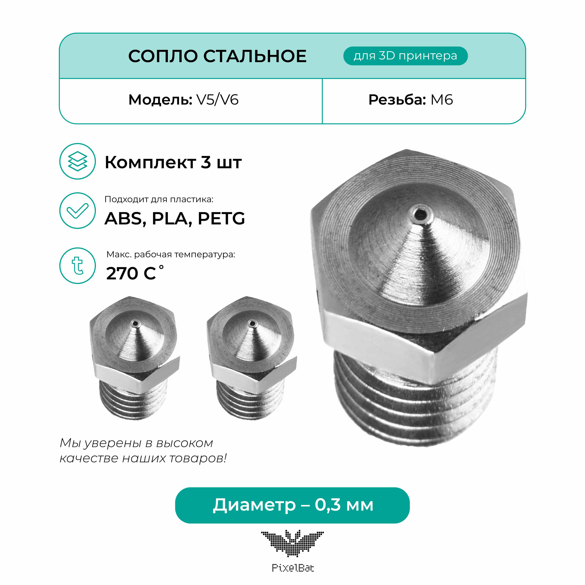 Купить Сопло стальное комплект 3шт 0.3мм, комплектующие для 3D принтера, V5/V6