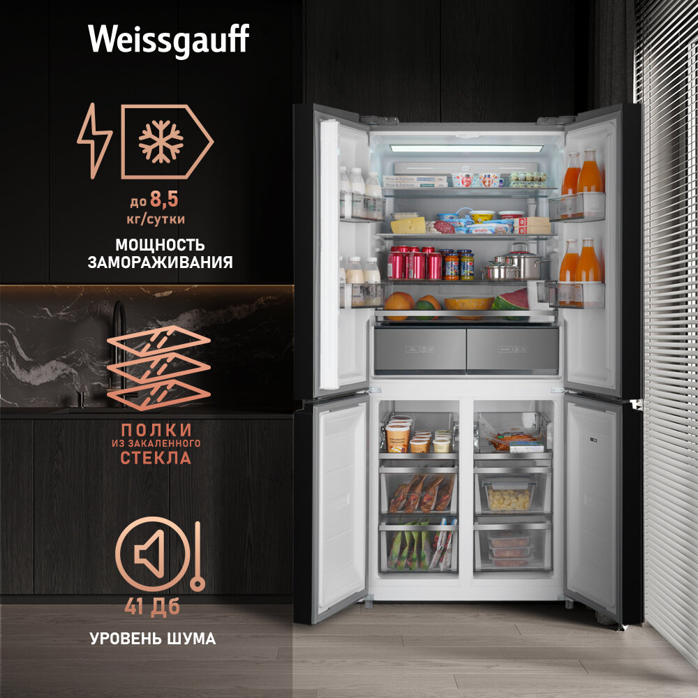 Отдельностоящий холодильник с инвертором Weissgauff WCD 590 Nofrost Inverter Premium Ecofresh Black Glass 3 года гарантии, CrossDoor, технология Multi Air Flow и Metal-Tech Cooling, суперзаморозка, суперохлаждение, LED-освещение