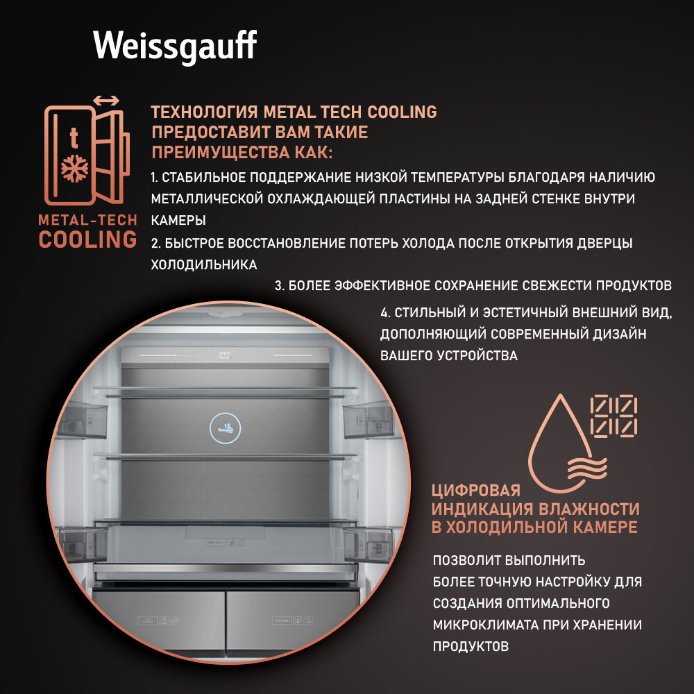 Отдельностоящий холодильник с инвертором Weissgauff WCD 590 Nofrost Inverter Premium Ecofresh Gold Glass 3 года гарантии, суперзаморозка, суперохлаждение, Инновационная система Metal-Tech Cooling