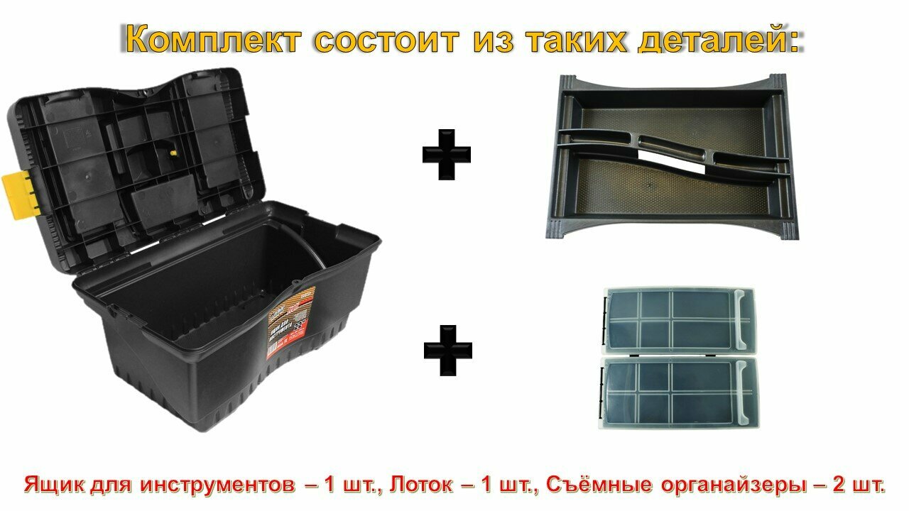 | Подробная комплектация | Скользящий лоток, что облегчает поиск нужного инструмента. В крышке ящика расположены три удобных органайзера, два из которых снимаются и могут использоваться независимо от ящика. |