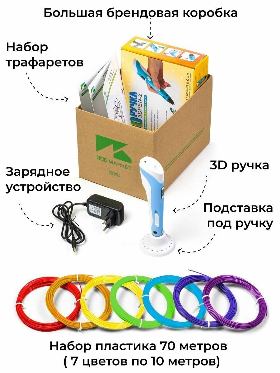 | Комплектация | 3D ручка, подставка под ручку, зарядное устройство, набор трафаретов, набор пластика 70 метров ( 7 цветов по 10 метров) |