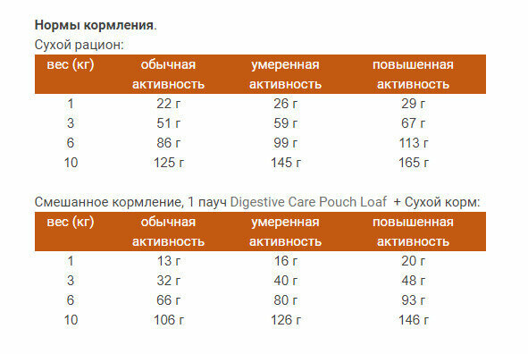 | Дозировка | см. таблицу. Корм готов к употреблению. |