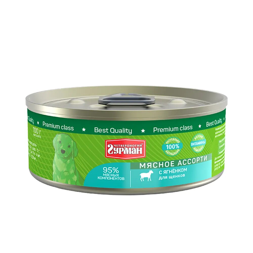 Консервированный корм для щенков, Четвероногий Гурман, мясное ассорти с ягннком, 100 г, 1 шт.