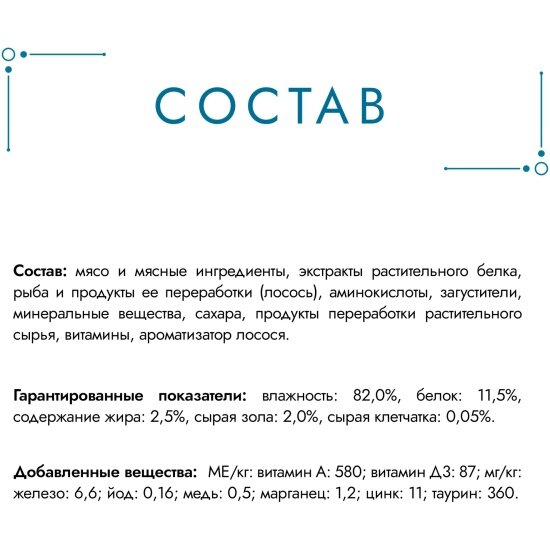 | Витамины | Д3: 99 МЕ/кг; таурин: 410 мг/кг |