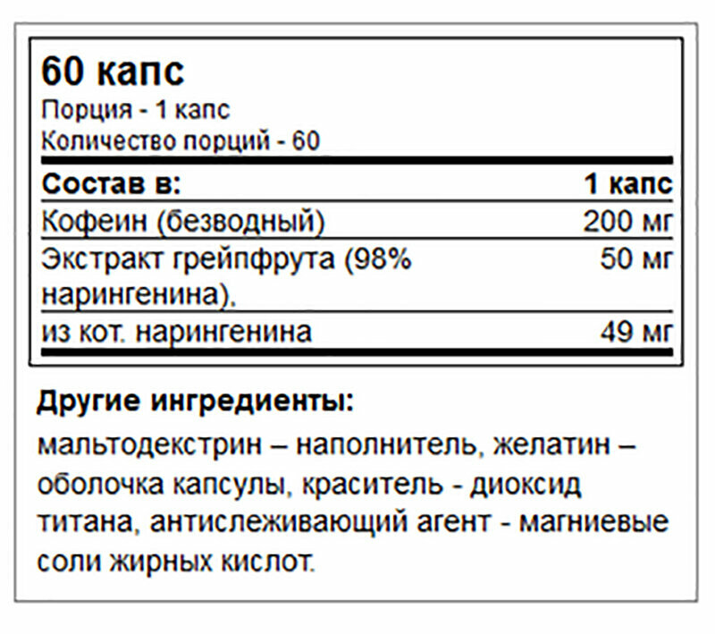 | Дополнительная информация | рекомендации по применению: Рекомендуемая порция – 1 капсула 1 раз в день, за 30 мин. до начала тренировки. Препарат запить около 300 мл воды.; состав: Состав 1 порции (1 капс): Кофеин (безводный) - 200 мг, Экстракт грейпфрута (98% нарингенина) - 50 мг, из кот. нарингенина - 49 мг, мальтодекстрин – наполнитель, желатин – оболочка капсулы, краситель - диоксид титана, антислеживающий агент - магниевые соли жирных кислот. |