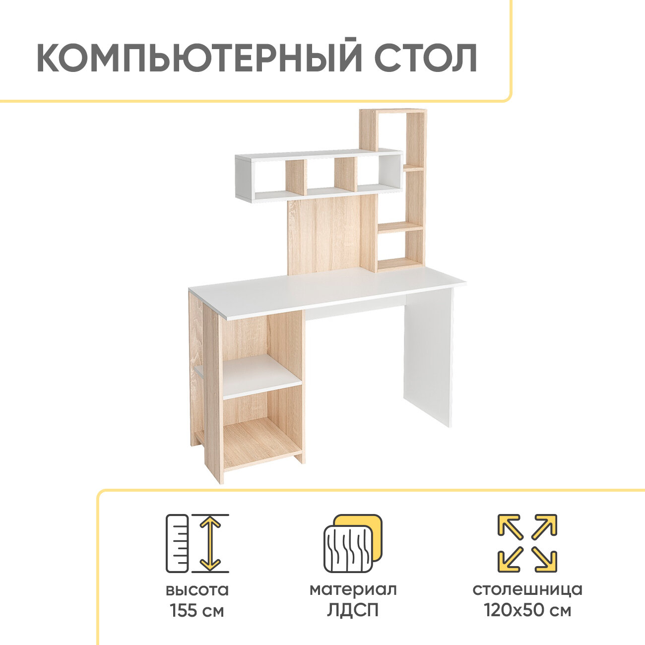 Купить Стол компьютерный письменный Олимп с полкой надстройкой и полками, белый/дуб сонома