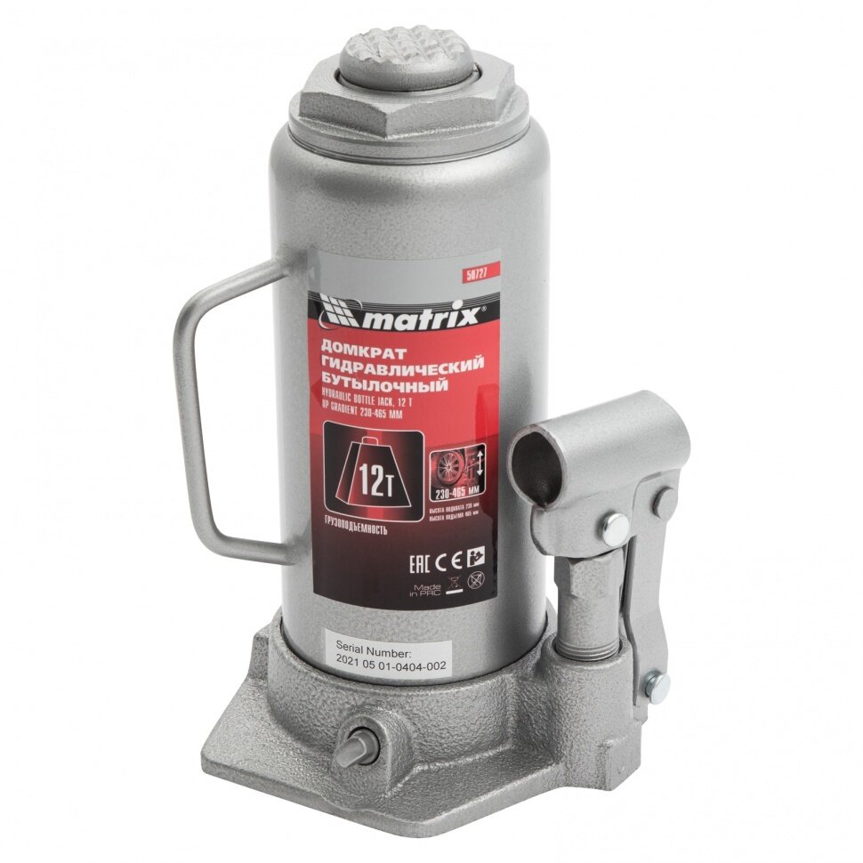 Купить Домкрат гидравлический бутылочный, 12 т, высота подъема 230-465 мм Matrix