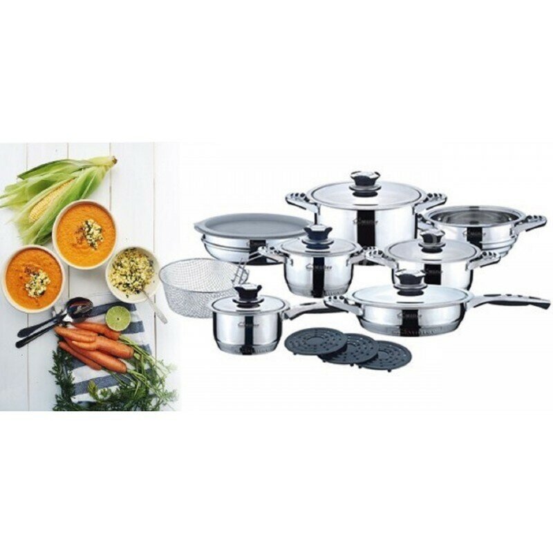 | Комплектация | 3 кастрюли: 6.3 л, 3.1 л, 1.6 л; ковш: 1,6 л; сковорода: 24 см; пароварка: 3.2 л; крышка 5 шт; салатница с крышкой; сетка для фритюра; бакелитовая подставка 3 шт; ручка на присоске; книга рецептов |