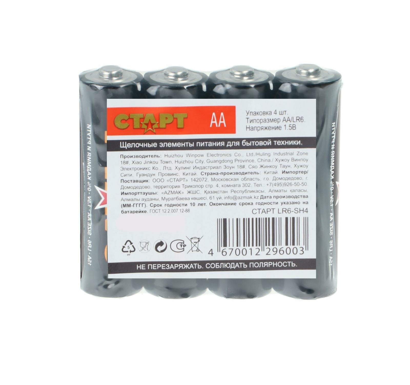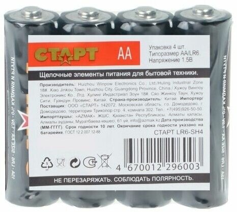 Батарейка алкалиновая Старт LR6-SH4 АА пальчиковые, 4 шт в пленке