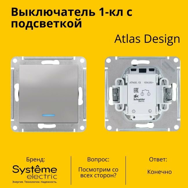 СохранитьВыключатель одноклавишный с подсветкой (индикацией) Schneider Electric (Systeme Electric) Atlas Design механизм алюминий ATN000313 3шт интересное: