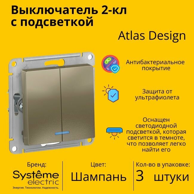 Купить Выключатель двуклавишный с подсветкой (индикацией) Schneider Electric (Systeme Electric) Atlas Design механизм шампань ATN000553 3шт