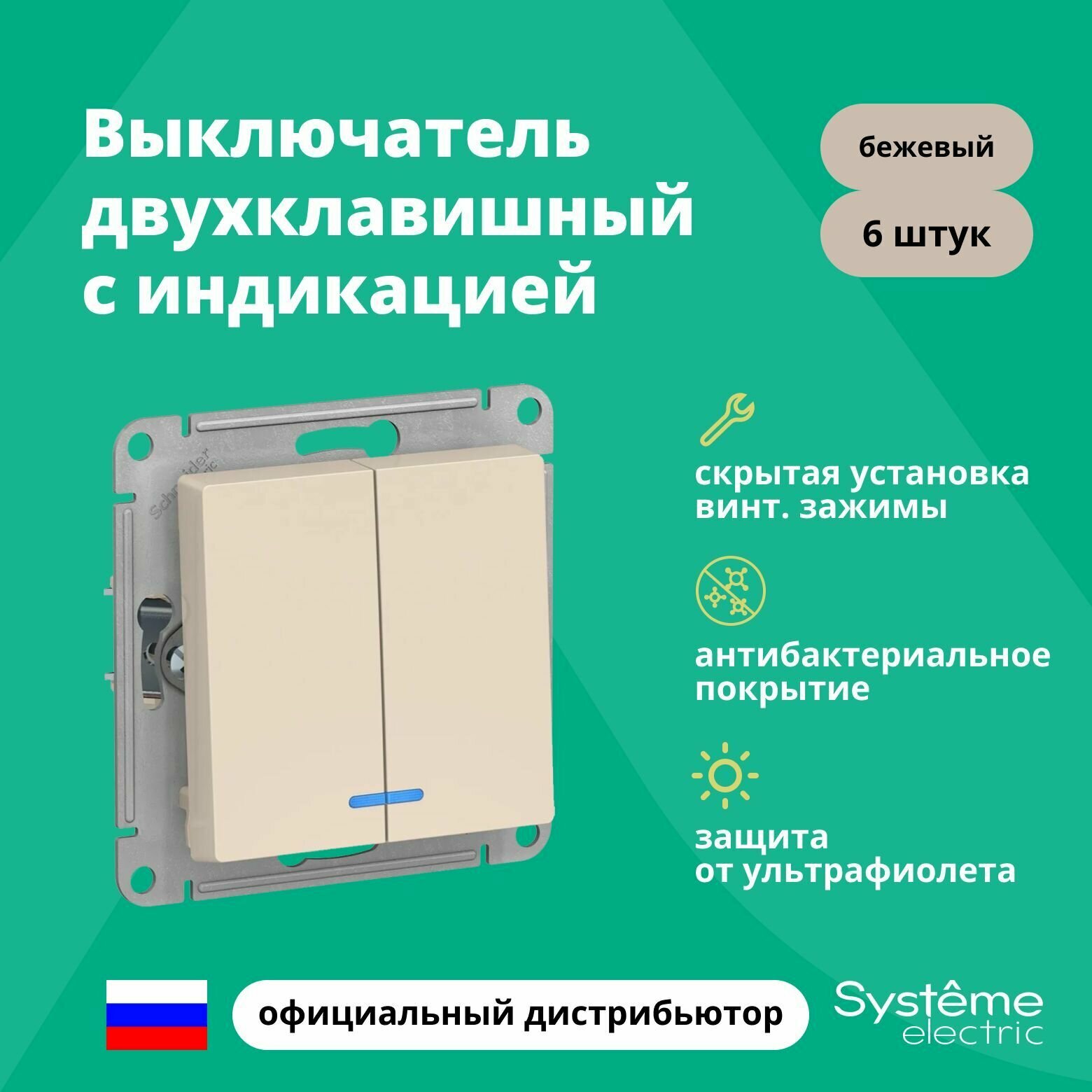 Купить Выключатель двуклавишный с подсветкой (индикацией) Schneider Electric (Systeme Electric) Atlas Design механизм бежевый ATN000253 6шт