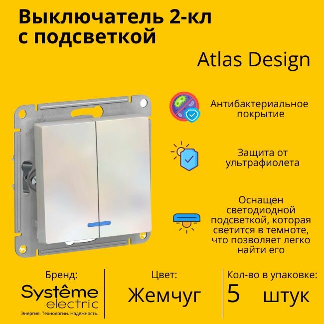 Купить Выключатель двуклавишный с подсветкой (индикацией) Schneider Electric (Systeme Electric) Atlas Design механизм жемчуг ATN000453 5шт