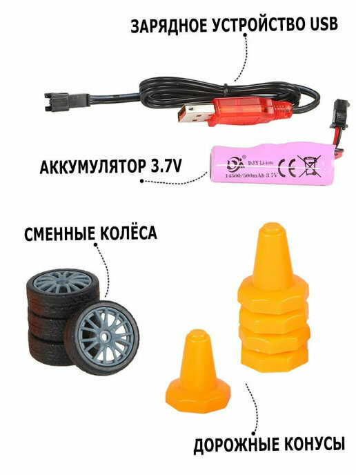 | Комплектация | машина, пульт управления, съемный аккумулятор, зарядное устройство, 4 запасные шины, 6 конусов |