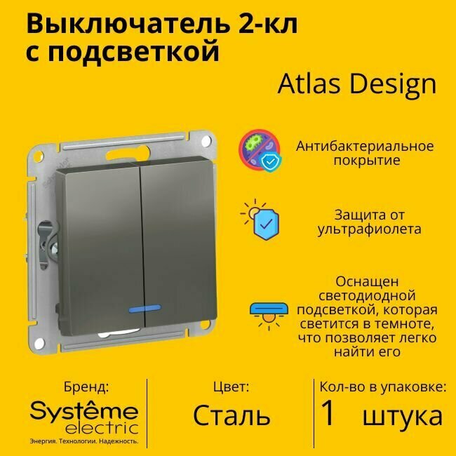 Механизм выключателя 2-кл. СП AtlasDesign 10А IP20 (сх. 5а) 10AX с подсветкой сталь SchE ATN000953 (3шт. в упак.)