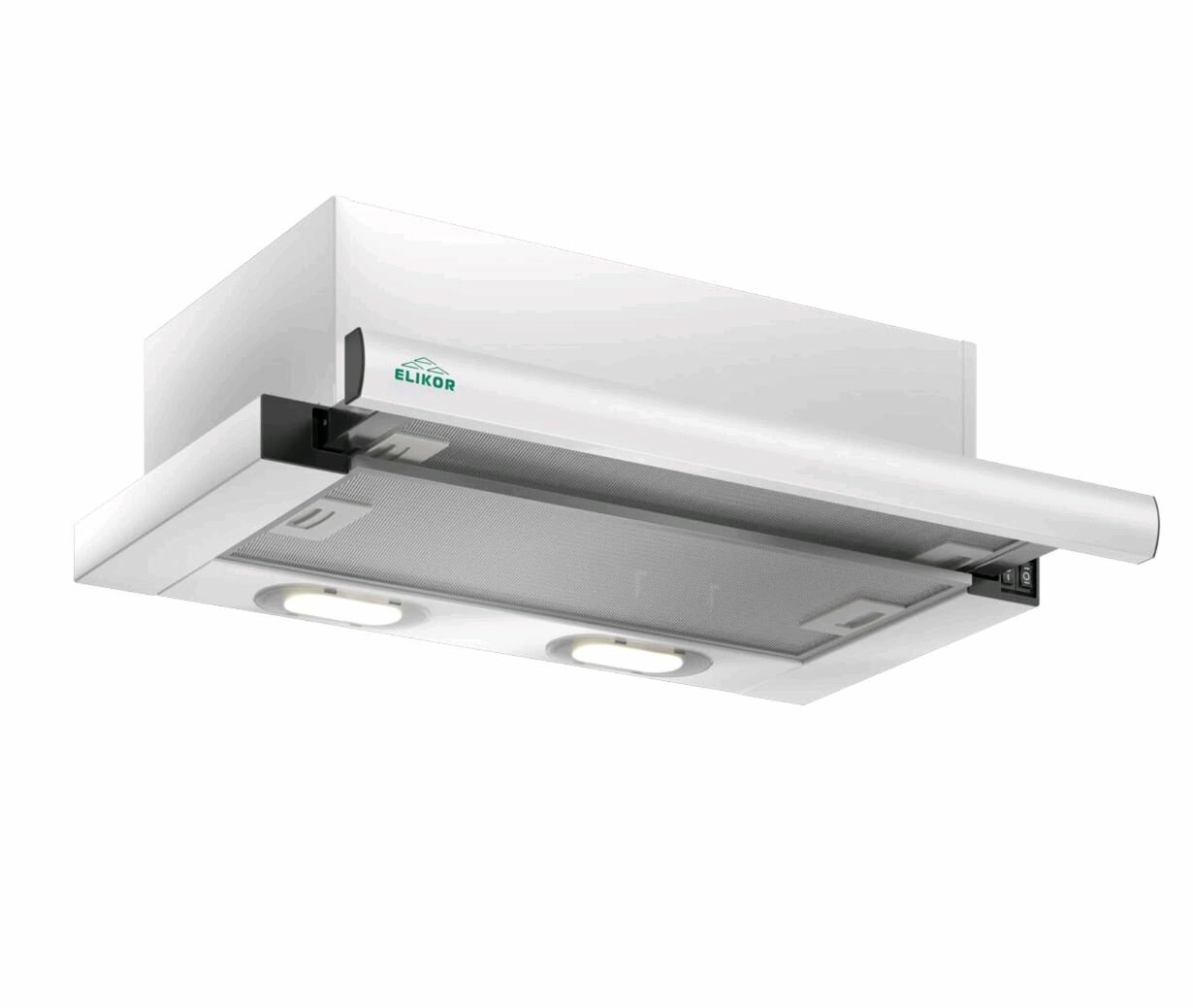 Вытяжка кухонная 45 см ELIKOR Интегра, встраиваемая, телескопическая, производительность - 400 м3/ч, управление клавишное, 2 скорости, лампы накаливания, белый / серебристый